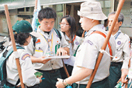 【人間社記者陳德啟、本璞大樹報導】「太陽在天空發出微笑,歌聲嘹亮,我們精神好,邁開大步向前走,加油!加油!……」一群熱心於佛光童軍團的服務員,十八日在佛光山精神抖擻高唱「加油歌」後,沿著佛光山周邊綠色小徑展開探險活動。