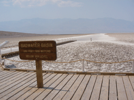 才進入死亡谷裡,我便想,值得的,比待在拉斯維加斯樂園般的飯店裡值得的!因為我們彷彿進入想像中的火星或是什麼不毛的星球。放眼一大片高低起伏的漠地,標示上寫著「Devil s Golf Course」,兒子問為什麼叫「魔鬼高爾夫球場」?我說:「你不覺得這裡就像個高爾夫球場嗎?可是鬼才會來這種地方打球呢!」與其說像高爾夫球場,其實更像一片鹽田,地表上好似結著白霜。老公告訴我,確實就是鹽田,這裡以前是個內海啊!但這裡的鹽不准撿回去,務求保留此地原貌。