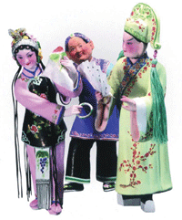 三個人物的構圖、玉姣、傅朋分列左右,媒婆立後。玉姣以手絹遮面,傅朋持折扇,示秀才身分。