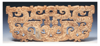 戰國時期不僅在規律性的紋飾方面做各種不同的變化,同時還興起一些具有帶狀身軀的龍紋與鳳鳥紋。這些龍鳳紋呈側面或俯視下的形象,彼此之間以共用、依附或交疊的方式組合在一起,並依照左右對稱的形式布局。因為玉工將龍鳳紋形體之外的玉料都透穿成空,所以成為群體動物紋組合的鏤空玉飾,是戰國時期特有的器物。