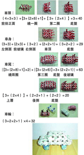 婚前常聽人說,有很多男人會把「車子」當成「小老婆」來愛,果不其然,外子堪稱最佳表率!洗車打蠟是例行公事,擦車吸塵乃家常便飯,讓身為「大老婆」的我也只好愛屋及烏,一起「愛車」啦!汽車的編法其實不難,方方正正的很容易就摺出角度,只要細心的拿捏轉折處,每個人皆可輕易上手。