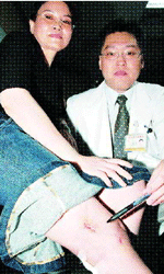政府提倡節能減碳,鼓勵大家多騎單車,但沒有做好防備容易受傷。一名四十九歲的陳女士(左),日前騎腳踏車不慎跌入約五公尺深山谷,身體多處擦傷同時右膝後側被一枝直徑約一點五公分長約五十公分的樹枝穿過到醫院急診。她嚇的說,以後不敢再騎單車上路。