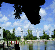 從市區開車將近五十分鐘後終於找到這個還在興建中的花園,一入山門口居然是雄偉的寺廟牌樓,剎那間時空倒轉,我幾乎以為到了一間中國的大寺廟,隨後沿著道路向前行,映入眼簾的是十八尊奇特的石雕羅漢像,一尊尊展現出灑脫自在的神態,穿過溪流旁的橋,山坡上數百尊彩色的兵馬俑隨風迎向來山的人們表達歡迎。後山是三十三觀音菩薩的自在像和阿彌陀經裡的十大弟子像在山坡上樹叢裡說法。