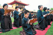 昨天清晨,在鐘鼓齊鳴中展開正授儀式,三師和尚為大眾迎請諸佛菩薩、護法龍天證盟,為大眾授與五戒、菩薩戒法。人間社記者莊美昭攝