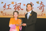 陳偉才(右)接受加拿大國會參議員利德蕙頒發譗紅楓傳奇豃獎。人間社記者劉北林攝