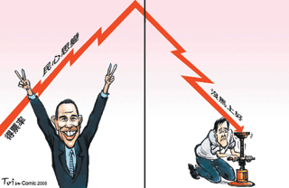 問題是,歐巴馬雖能以「黑人甘迺迪」的乾淨形象,以「我們可以改變」的口號勝出(就好像馬英九以股票兩萬點、馬上好等口號勝出),然而投給他的選民中,有多少是因為經濟情勢太壞,布希太糟糕,不得已之下才投給民主黨(而非歐巴馬),賭一把的相信歐巴馬能帶來「改變」(就像綠營票倉的南部選民大力支持馬英九)?