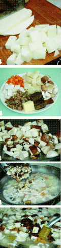 {1}香菇、杏鮑菇、紅蘿蔔、馬鈴薯切塊備用。