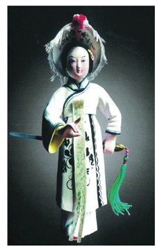 單尊形象造型,表現的是白素貞亮相動作:頭戴帷帽、左手按劍、右手作蘭花指前指、左腳露出裙外,有邁步前行的意味。塑造手法簡潔、裙體以三篤板完成愈顯幹練有加。賦色以白為主、帽、衣、裙衫皆白底,彩繪以黑為主,紋飾結構亦簡潔流暢。帷帽沿以紅花、紅絨球與裙底紅鞋相呼應,在黑白基調上,頗為醒目,色彩因此而響亮。