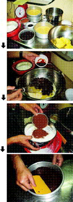 材料:低筋麵粉九十克、蛋六顆、細砂糖三百克、奶油二百五十克、苦甜巧克力豆四百克、可可粉六十五克、濃縮咖啡水十五克、碎核桃一百五十克。