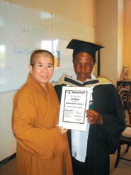 依淳法師恭喜年紀最大的學員Siphenge完成電腦訓練課程。人間社記者賴彥林攝