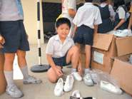 在該校副校長林秀鳳安排下,清寒的學童優先領取鞋子。孩童非常有秩序地排隊試穿新鞋,由於他們的鞋子非常破舊,所以當拿到新鞋子時,臉上都洋溢著燦爛的笑容,並感恩基金會及義工的照顧。 (人間社記者張瑞玖攝)