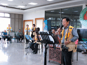 潭子分會會長游村平帶領的國樂團隊,為長者演奏懷念老歌,養護中心員工林永來也共襄盛舉,演奏二首優雅的歌曲,長者楊美容歡喜高歌一曲「媽媽」與大眾結緣,並分享每日持誦「觀世音菩隡聖號」的感應。