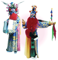 單尊人物造型。右為《盜御馬》中亮相形象,取金雞獨立姿勢,是行進之態;造型上以長袍後片落地的方法,解決人物的平衡問題,也加強作品輪廓的完整性。左側為直身袍做法,人物微欠身拱手,側面昂首,有英雄磊落之相。兩作賦色皆以藍襯紅,對比強烈,裝鑾以蘆花雞毛作翎毛,又突出草莽英雄本色。