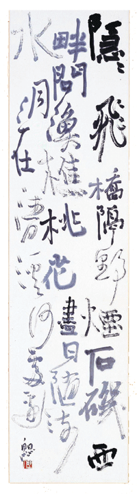 附圖為筆者之「唐詩寫意書法」作品。張旭又「桃花源」詩:「隱隱飛橋隔野煙,石磯西畔問漁樵;桃花盡日隨流水,洞在清溪何處邊。」