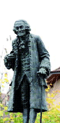 拜現代科技之賜,我們跟隨著導航系統找到了這個小鎮,開到市中心才發現原來伏爾泰的紀念雕像就在路的正中間,楓紅的秋葉旁,伏爾泰正笑眯眯地站在一塊岩石底座上,長髮披肩,身著大衣,微弓著背,手拄拐杖,仿佛剛從遠方的巴黎回來。在蒼冷的秋日下,他的那雙眼睛深遂而充滿智慧,揶揄戲謔的微笑中注視著往來這個小鎮的每一個人,可以看到他堅韌的意志、諷刺的才智和洞察毫末的穎慧。