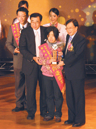 行政院長劉兆玄(右)與內政部長廖了以(左),頒發金鷹獎盃給陳姿蓉(中)。
