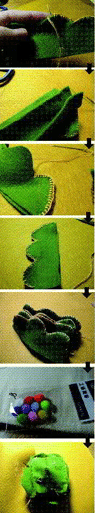 {3}還未完成最後一個縫邊時,先由反面縫毛毛球,才不會加重縫毛球的麻煩。
