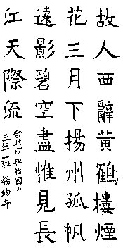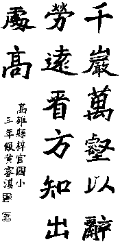 《小小書法家》 楊絢卉 黃睿淇 |2008.12.01 語音朗讀 523觀看次 字級 大 中 小 楊絢卉(台北市興雅國小三年一班)黃睿淇(高雄縣梓官小三年四班) 前一篇文章 《心靈小郵差》 下一篇文章 《童話果菜園》綠綠村的神祕嘉賓 熱門新聞 01與精品品牌撞鞋 印度涼鞋打專利戰2025.12.2102佛光山高雄佛教堂 營建工地評鑑特優2025.12.1903太陽瓶燈泡 點亮貧困家庭希望 2025.12.1904銀杏點亮.東京印象2025.12.2305邂逅佛教 安頓身心2025.12.2106【時光重逢】花宅海邊美術館2025.12.1907北島佛光山獲四星肯定 園林躍升具重要意義庭園2025.12.1908【動物奧斯卡獎】猜猜誰最會演(上)2025.12.2109日球星率道奇連霸 2025體壇最驚奇 2025.12.1910社論--瞋恨的危害2025.12.21 訂閱電子報 台北市 天氣預報 台灣一週天氣預報 相關報導 【快樂塗鴉簿】美麗的外師賈西亞 【快樂塗鴉簿】快樂動物園 【童詩.童思】 動物園【快樂塗鴉簿】熱氣球嘉年華【原民說故事】永遠的山風(上)【快樂塗鴉簿】公園的貓