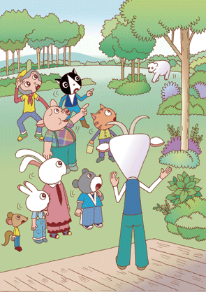 過了不久,山羊村長站在廣場的台上說:「各位村民大家好,謝謝大家都這麼關心節能減碳的話題,等一下『神祕嘉賓』到達時,我們就開始了。」「神祕嘉賓?什麼神祕嘉賓呢?」