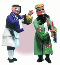 張義著紫衣褲,白裙白襪,色彩單一而豔俗。右手指向左手提舉的金龜,側身回首,笑意盎然。開相短眉大眼、塌鼻小口,有忠厚之貌。