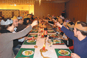 佛光山日內瓦會議中心國際青年「星光燦爛」感恩聯歡派對,與會者舉杯互相祝福。多樣精緻的素食料理讓所有來賓們吃得津津有味、讚歎不已!人間社記者楊正妃攝