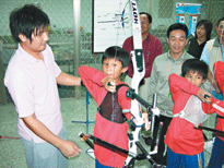 【本報花蓮訊】雅典奧運射下銀牌的國手王正邦昨天到中華國小傳授小將射箭技巧,副縣長張志明也上場彎弓練射,才發現要射好箭並不容易。