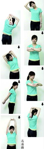 {5}軀幹側彎:輕鬆站立,雙腳與肩同寬,雙膝微彎,將左手臂高舉過頭,右手在頭後輕拉左手手肘,同時軀幹向右側彎,直到感覺肌肉緊繃,維持八到十五秒。放鬆回復,往反方向重複上述動作,兩側各作數回。