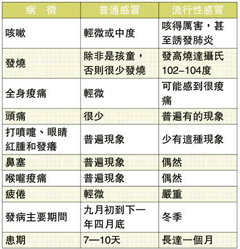 以下普通感冒和流行性感冒差別的表格為作者提供: