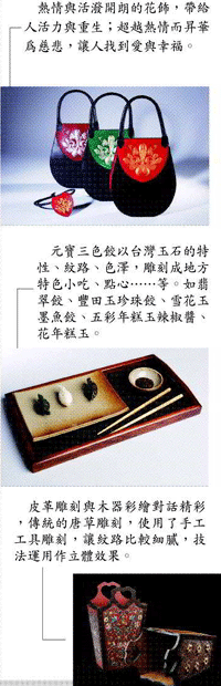 【新品味】為年景增添古典風華 黃艾梅 |2008.12.24 語音朗讀 698觀看次 字級 大 中 小 台灣工藝已走向自然、科技、環保,回歸本土的趨勢,當科技遇上工藝,標榜前衛時尚的設計新紀元中,有哪些價值能細水長流?泰雅族傳統編織藝術、陶瓷音箱、木頭工藝,竹編筆電包、石刻、皮革雕刻、彩色玻璃及琉璃藝品都十分新奇有趣,作品皆以「樂在當下」的生活意念來詮釋現代工藝的樂活精神,材質與形體最終呈現出創新、趣味、美感等樣貌。這些創新工藝作品尤其適合當做新春居家擺設,為年景增添古典風華。 前一篇文章 【銀髮熟年】天天都唱生日快樂 下一篇文章 【兒童瑜伽動園】開展淋巴 強化免疫力:打電話 熱門新聞 01渥太華佛光山 授海狸童軍領巾2025.11.1702警告日本 陸黃海軍演、籲暫勿遊日 2025.11.1603【詩】遊園地.競馬場2025.11.1704墨西哥熱氣球節 高空爭豔2025.11.1605芬普尼毒蛋 又爆4萬顆流入市面2025.11.1606克林姆富家女肖像畫 估值46億元2025.11.1707落葉刺繡 巴西百鳥寫真集2025.11.1708【快樂塗鴉簿】熱鬧的內灣小鎮2025.11.1709AMR機器人 是什麼?2025.11.1710中日緊張 陸4海警船巡航釣魚台2025.11.17 訂閱電子報 台北市 天氣預報 台灣一週天氣預報 相關報導 【生活快門】天然遮陽傘【悅讀人生】弱肌阿媽動起來【生活快門】 荷止一種? 【愛的關鍵字】 老壯世代的共居挑戰【生活快門】舒心綠鋼琴【情緒漩渦】尋找真正的自己