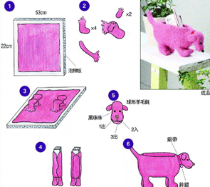 材料:深粉紅羊毛纖50g、繡線鼻子、黑珠珠2顆、紅緞帶12cm、項圈鈴鐺1顆
