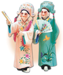 兩個人物的構圖,左為祝英台,右為梁山伯。造型反映現代審美意趣,人物頭模不同傳統頭模的細目小口,有濃眉大眼的傾向。彩繪賦色以粉紅映襯翠綠,冷暖色調對比造成作品的鮮明性,勾勒描繪工整嚴謹,一筆不苛。梁山伯袍服以蝶花為飾,祝英台袍服則以牡丹為題材,寓其國色天香之意。