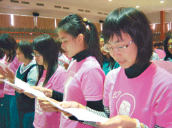 台南家齊女中舉行「點亮心燈—開啟考生智慧祈福典禮」,圖為學生讀誦〈為考生祈願文〉。人間社記者平曜攝