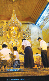 男信眾為馬哈牟尼佛塔佛像貼金箔。人間社記者賴台生攝