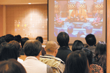 十一日師徒接心活動,千餘信眾湧入佛香講堂,在各廳堂藉著同步轉播,聆聽星雲大師開示。圖為大眾在滴水坊觀看大螢幕的情景。人間社記者黃偉強攝