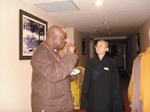 西來大學博士生Larry(左)與英文佛學院有律法師,會後繼續討論問題。人間社記者心岸攝