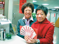 本報長期讀者彭雲芳(右)昨天一領到消費券,在二姊彭雲畹陪同下直奔總社,寫下一份關懷年訂單。