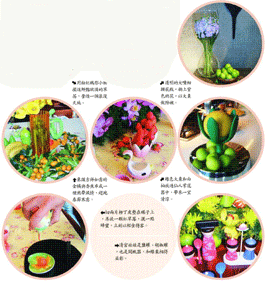 在繽紛的花藝世界中,尋找到水果為春節居家所妝點的神奇,單一擺設水果不夠豐富,邀請小巧家飾及鮮花融入其中,一屋子都元氣十足!