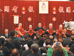 馬總統與吳伯雄、立法院長王金平、立法委員吳志揚、心培和尚,分別手拿「牛」、「年」、「旺」、「台」、「灣」大字春聯,與四名國民黨副主席、秘書長吳敦義、考試院長關中及多名黨籍立委、民代、鄉鎮首長互相賀年。