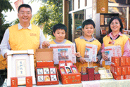 李建志(左一)全家從大年初一開始天天到佛光山福報推廣處當義工,和上山民眾結善緣。人間社記者邱愉攝