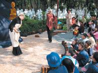 他們生動的表演吸引遊客停下腳步,開心地與劇團演員互動,小朋友從中體會到修福與修慧兩者缺一不可。