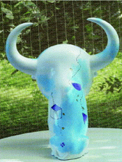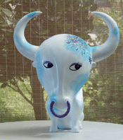 首先,我在白色的牛素胚上從牛角、頭到身軀、腳,都畫上藍色的雲朵,仿如一頭在雲端逍遙的快樂牛;最精彩的是在牛背身上畫了許多有飄浮感的幾何體,用了浪漫的紫色,其間又有落葉飄零,輕飄飄的,牛頭左邊有一紫色的天使圓環,右方有則裝飾了美麗的花環,牛的眼神,安詳優雅,牛身輕盈,是一種氣質莊嚴喜悅的清歡牛。