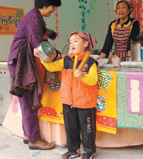 【人間社記者梁美圓大樹報導】「帥哥美女!緊來買喔!」「現炸的杏鮑菇,好吃甲會留口水喔!」(台語發音),年方五歲來自嘉義的小義工江世昌,在佛光山美食區現場,把鍋子當鑼,拿著桿麵棍,敲鑼打鼓地幫奶奶推銷食品,對著前來遊客吆喝著:「沒吃會後悔喔!」