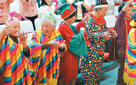 「社區照顧關懷據點回娘家」於佛光山舉行,圖為宜蘭九十五歲可愛阿嬤(左一)與各具造型的長者。人間社記者林美君攝