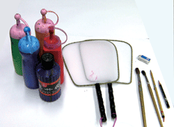 鉛筆、墨汁、水彩顏料、水彩筆、絹扇。