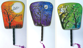 芭蕉葉型的扇子,看起來有一種古典的優雅。我們可以選擇簡易又具詩情的主題,比如月光灑在白雪上閃閃發光,再搭配樹木各種搖曳姿態,就會產生不同的風情喔!你可以畫一棵茂盛的樹,也可以畫兩棵夫妻樹對望,也可以畫成一叢熱鬧的小樹林。