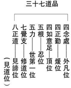 三、道品階位:於修道階位上,將三十七道品的內容,分別其階位。四念處,於藏通別圓四教上,各以念處為位,判在外凡位。四正勤是煖位,四如意足是頂位,五根是忍位,五力是世第一法位,七覺支是修道位,八正道是見諦(真諦)位。