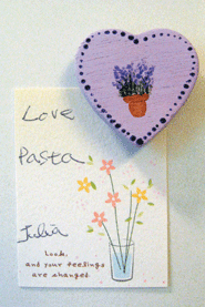 找到一紙心型小木器,正面彩繪上薰衣草的圖案,背面黏上吸鐵,即是一款簡單的手作吸鐵。除了彩繪,也可以運用小印章及專用顏料,蓋上各式可愛的圖案;或用碎布包裹,黏上一個小釦子,也很可愛。