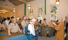 覺皇法師於健行最後一站Trinity Presbyterian教堂中,為近百位幼童軍、家長與領隊,介紹佛光山人間佛教與西來寺,並說明佛教倫理道德五戒與基督教十誡之異同,強調各宗教對不殺生、不偷盜、不邪淫、不妄語等倫理道德,皆有共同認知,是普世之標準;人間佛教認為人人守持五戒,即是自由真義,可讓世界趨於和平。隨後,帶領眾人發願,祝福鄰人能「圓滿人格」,並以佛光山開山星雲大師一篇〈佛光祈願文〉做為閉幕祝禱。 (人間社記者張志誠攝)