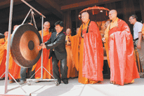 灑淨時,佛號聲與大悲咒聲中,大師帶領功德主沿著會場中的舍利塔繞行,知客法師引導貴賓散花並繞塔一匝,大師誦讀〈恭迎佛牙舍利文〉,為大眾祈願祝禱。