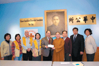 永固法師和王如茵會長代表國際佛光會捐助美國紅十字會一萬美元,協助華埠大火善後工作,由中華公所主席于金山(左五)代表接受,右二起為主席助理戴日基、祕書長黃玉振、永固法師、于金山、國際佛光會紐約協會長王如茵。人間社記者性緣攝